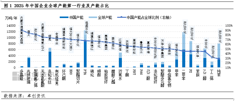 中国石化产能领先行业覆盖了基础化工原料、合成树脂、化纤等全链条。据卓创资讯(301299)红桃3数据显示,在基础原料领域,中国乙烯产能2025年超过6200万吨/年(全球占比25%),苯产能占全球产能超过30%、二甲苯产能占全球总量的50%;在合成树脂领域,聚乙烯、聚丙烯产能分别达3900万吨/年、4800万吨/年,均为全球第一;在化纤领域,PTA产能占全球的72%以上、聚酯纤维产能占全球的60%以上,且头部企业(如恒力、逸盛)的产能规模是海外同行的2-3倍。