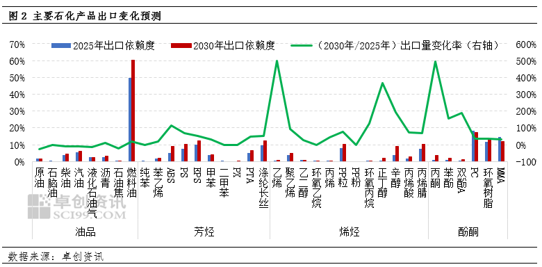 这一趋势在2025-2030年将进一步强化。从产品维度看,不同品类石化产品的出口依赖度持续提升:燃料油出口依赖度将从2025年的50%升至2030年的60%,涤纶长丝从9%增至12%,丙烯腈从8%增至10%,PTA也从5%提升至7%。从出口量来看,2030年丙酮、乙烯、正丁醇等产品出口量将较2025年提升300%以上。