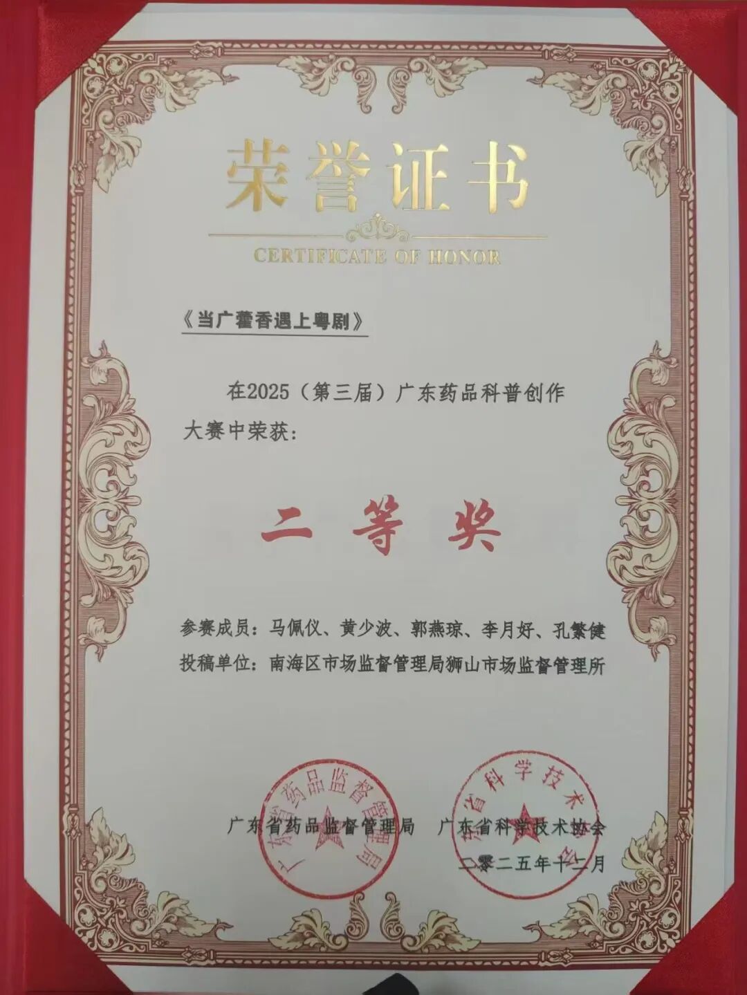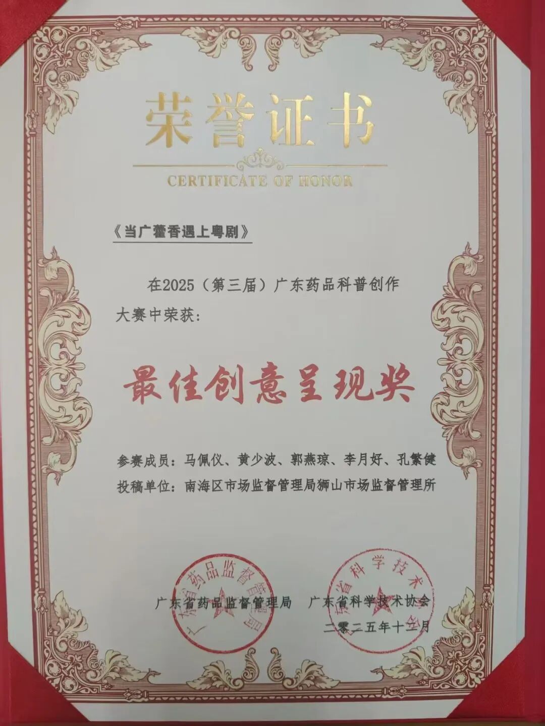 喜报!狮山市场监管所再创佳绩!在2025年全省药品科普创作大赛中,该所从2017件激烈角逐的作品中脱颖而出,6部作品成功入围。其中,匠心之作《当广藿香遇上粤剧》一举斩获大赛“二等奖”及“最佳创意呈现奖”两大奖项,